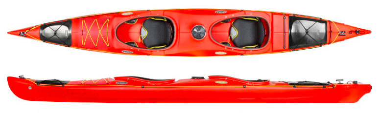 I hyran ingår tvåmannskajak med extra sittbrunn/lastutrymme för barn/hundar/extra packning, paddlar, flytvästar och kapell för 2 vuxna + 1 barn.